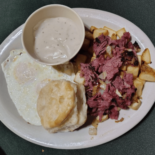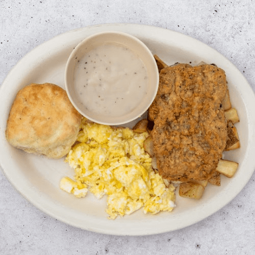 With home fries & grilled onions. Served with biscuit & gravy. Eggs: over easy, over medium, over hard, or scrambled.