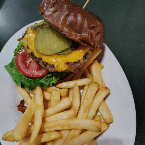 Two 4 oz beef patties with grilled onions & American cheese on rye. Choice of fries, sweet potato fries or fruit cup