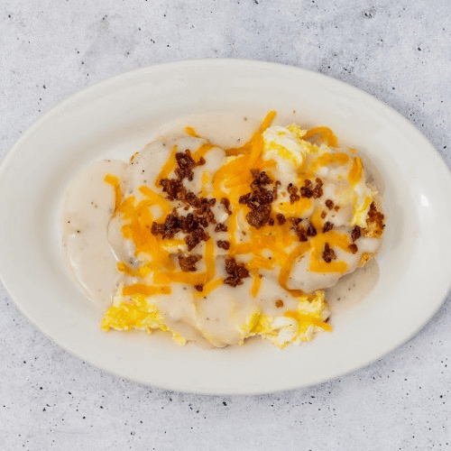 Grilled biscuit topped with gravy and eggs--over easy, over medium, over hard, or scrambled then sprinkles with bacon bits and cheddar.