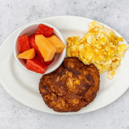 With 2 Scrambled eggs with cheddar cheese and fruit cup.