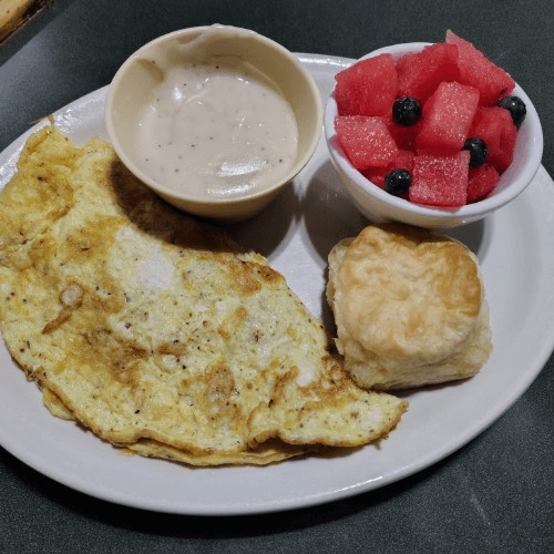3 eggs, onion, tomato, bacon and cheddar cheese with home fries or grits, Toast--White, Wheat, Sour Dough, Rye, Raisin, English Muffin, or Gluten Free per slice for an additional charge or biscuit & gravy