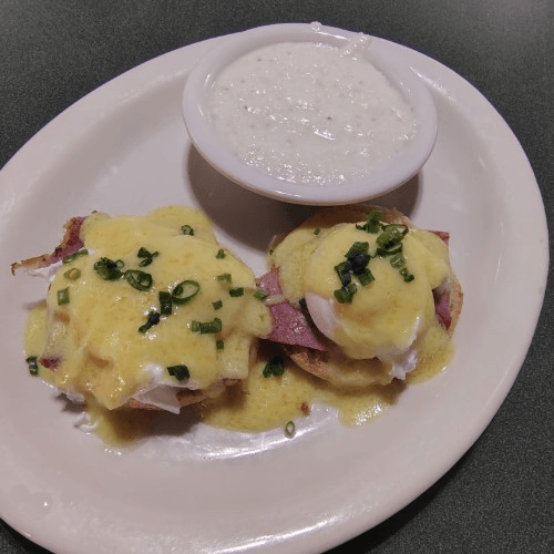English muffin with ham, poach eggs, and hollandaise sauce with choice of side: grits, home-fries, or fruit cup.