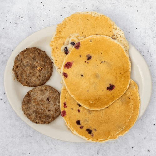 3 flapjacks stuffed with blueberry or banana pancakes and serve with bacon, or sausage.