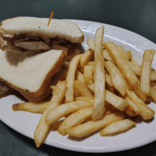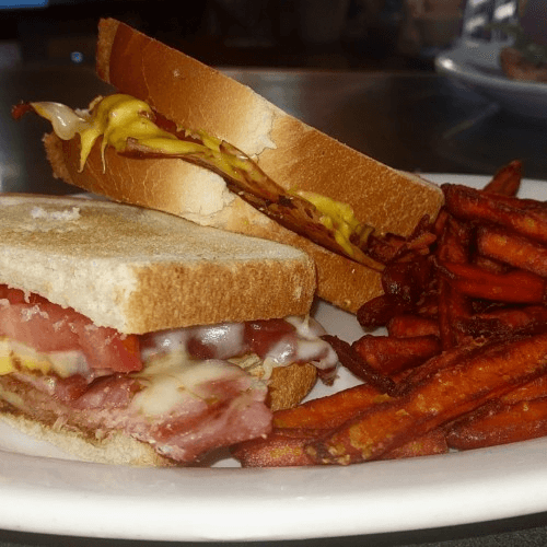 Ham, turkey, bacon & tomato with American & Swiss cheese sour dough bread. Choice of fries, sweet potato fries, or fruit cup
