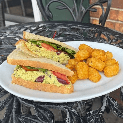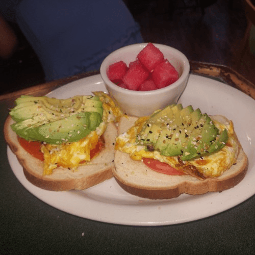 2 pieces of choice of toast--white, wheat, sour dough, English muffin, or gluten free per slice for an additional charge with tomato and avocado. Eggs: over easy, over medium, over hard, or scrambled.