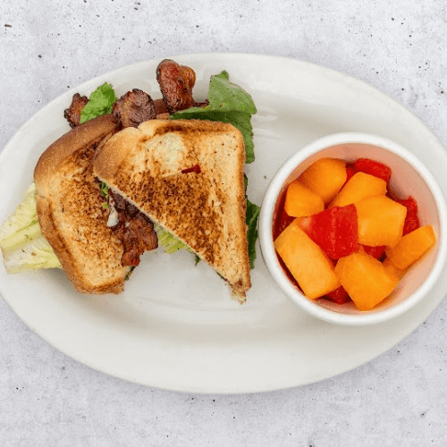 3 bacon strips, tomato slice, and lettuce served on your choice of toast--white, wheat, or sour dough and fruit cup.