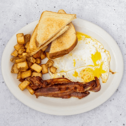 2 eggs: over easy, over medium, over hard, or scrambled, 3 bacon, home fries or grits, toast--white, wheat, sour dough, rye, raisin, English muffin, or per slice for gluten free for extra charge or biscuit & gravy.