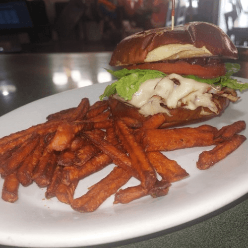 6 oz beef patty on pretzel bread with lettuce, tomato, pickle, onion & mayo. Choice of fries, sweet potato fries or fruit cup